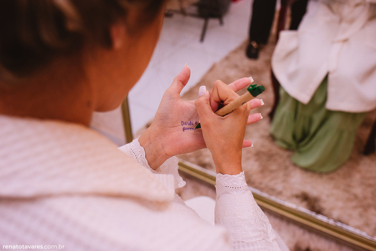Esse hábito de escrever nas mãos não morreu na vida dessa noiva, para não correr o risco de esquecer a letra da música que cantaria de surpresa para o noivo na hora da cerimônia, ela anotou um trecho na palma da mão, ali no making of mesmo.